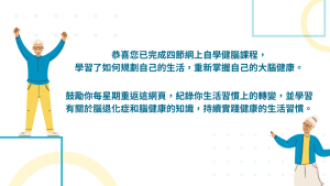 Published in: 東華三院 Author Janet Ho Published on: 2024 年 5 月 30 日 當前狀態 未報讀 價格 未公佈 開始 此组尚未公開 腦健康之基礎認識 現在報名 腦健康之生活日常(一) 現在報名 腦健康之生活日常(二) 現在報名 及早規劃和預防 現在報名 總結*(需完成以上課程才能上此課程) 現在報名